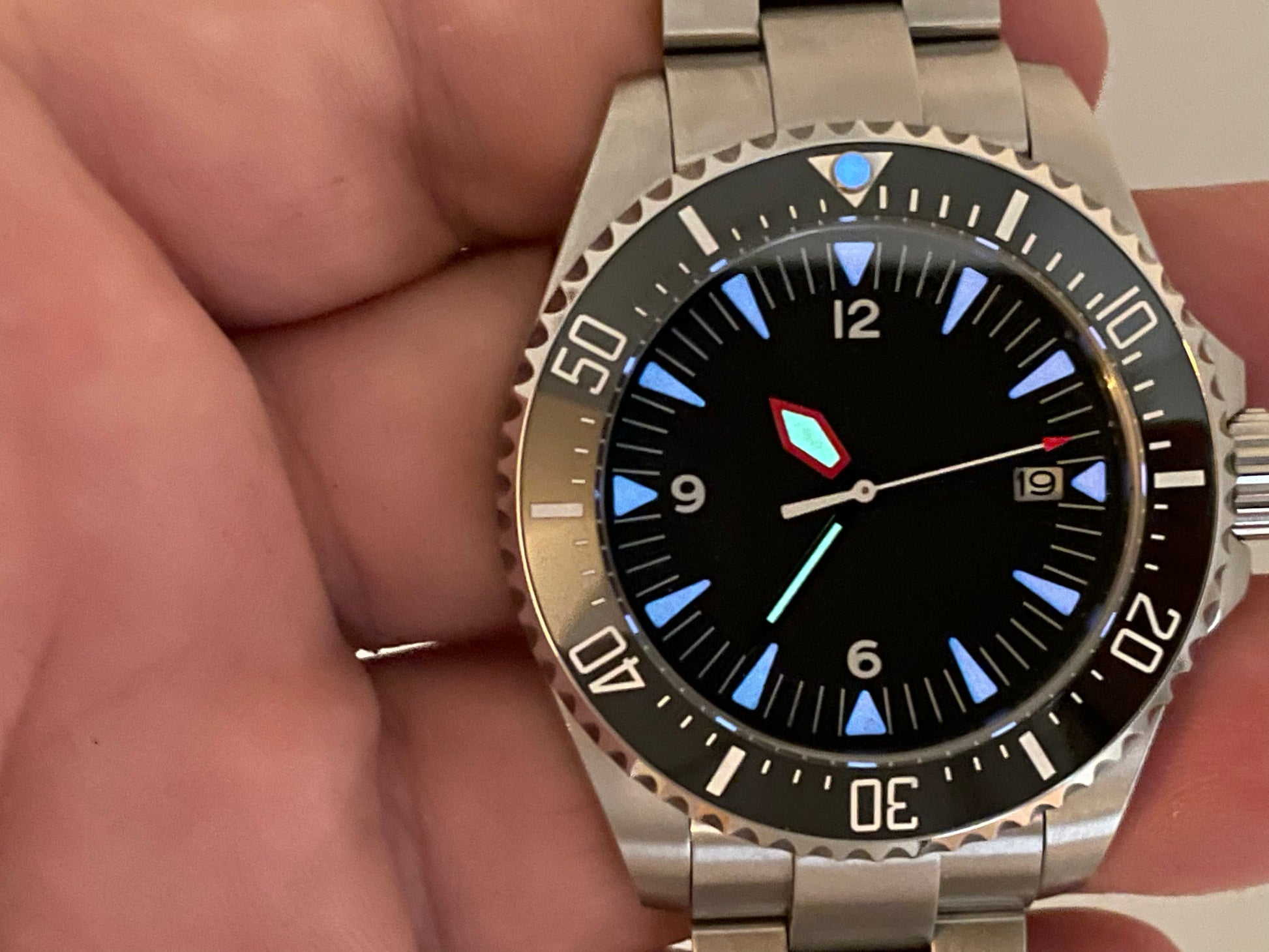 The Sub Instrument watch features an easily readable dial and hands with red accents and lume. The sub style, stainless case features a ceramic, unidirectional timer bezel; sapphire glass; glass display back; and screw down crown. Stainless bracelet with deployment clasp. 43mm diameter, 50mm lug to lug, 21mm lug width. Genuine Seiko NH35A movement.
